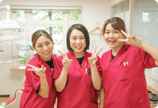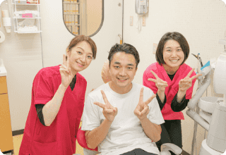 医院名の通りスタッフ達の笑顔の絶えない職場ですし⻭医者独特の消毒臭もせず清潔な空気に包まれて気持ちよく作業のできる場ですね。