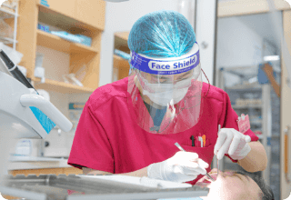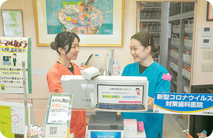 最新の機器や、大型の滅菌室を完備しており、感染症対策は消毒・検温・フェイスシールドなどのできることを徹底しています。